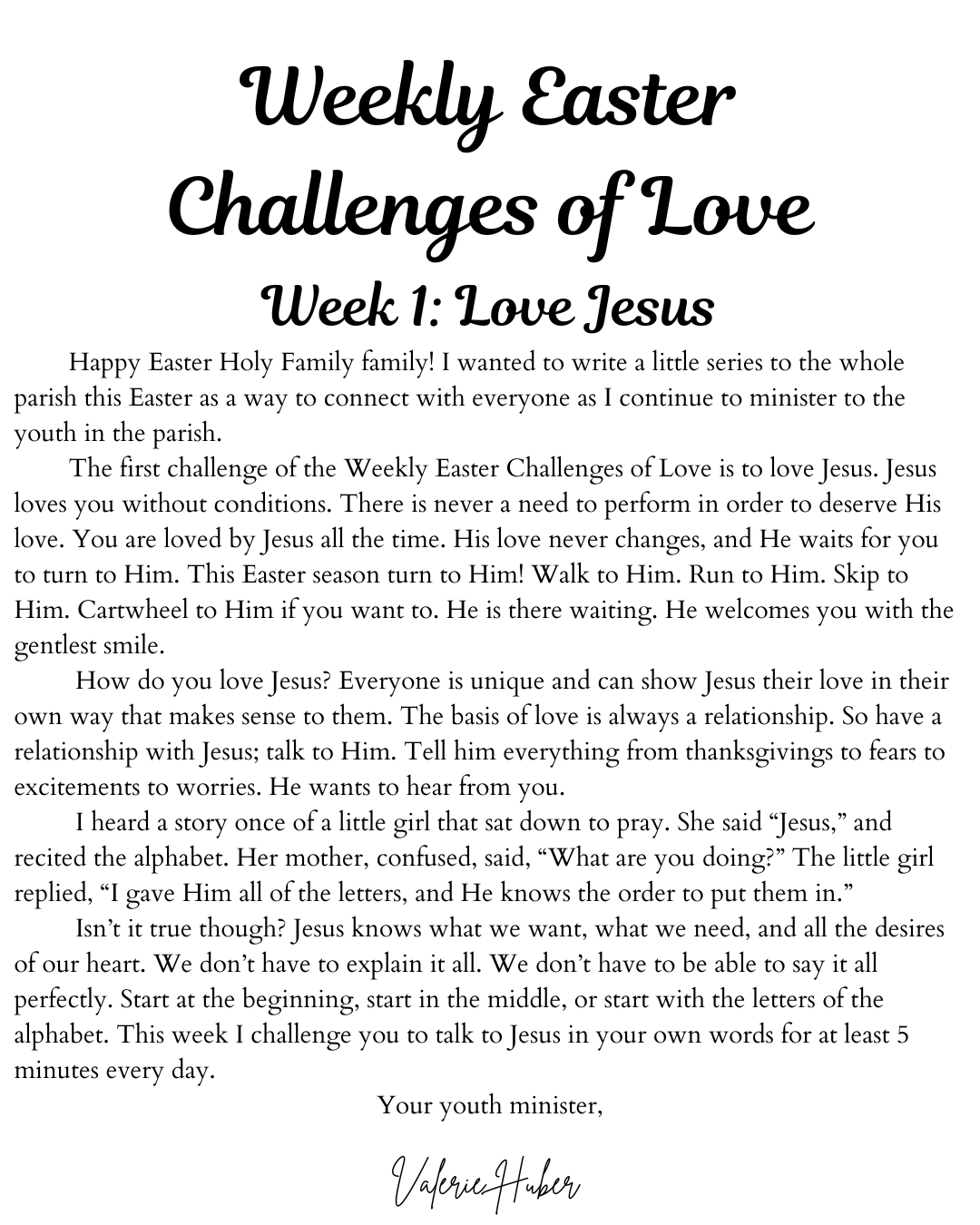 A letter from Youth Minister- Valerie Huber